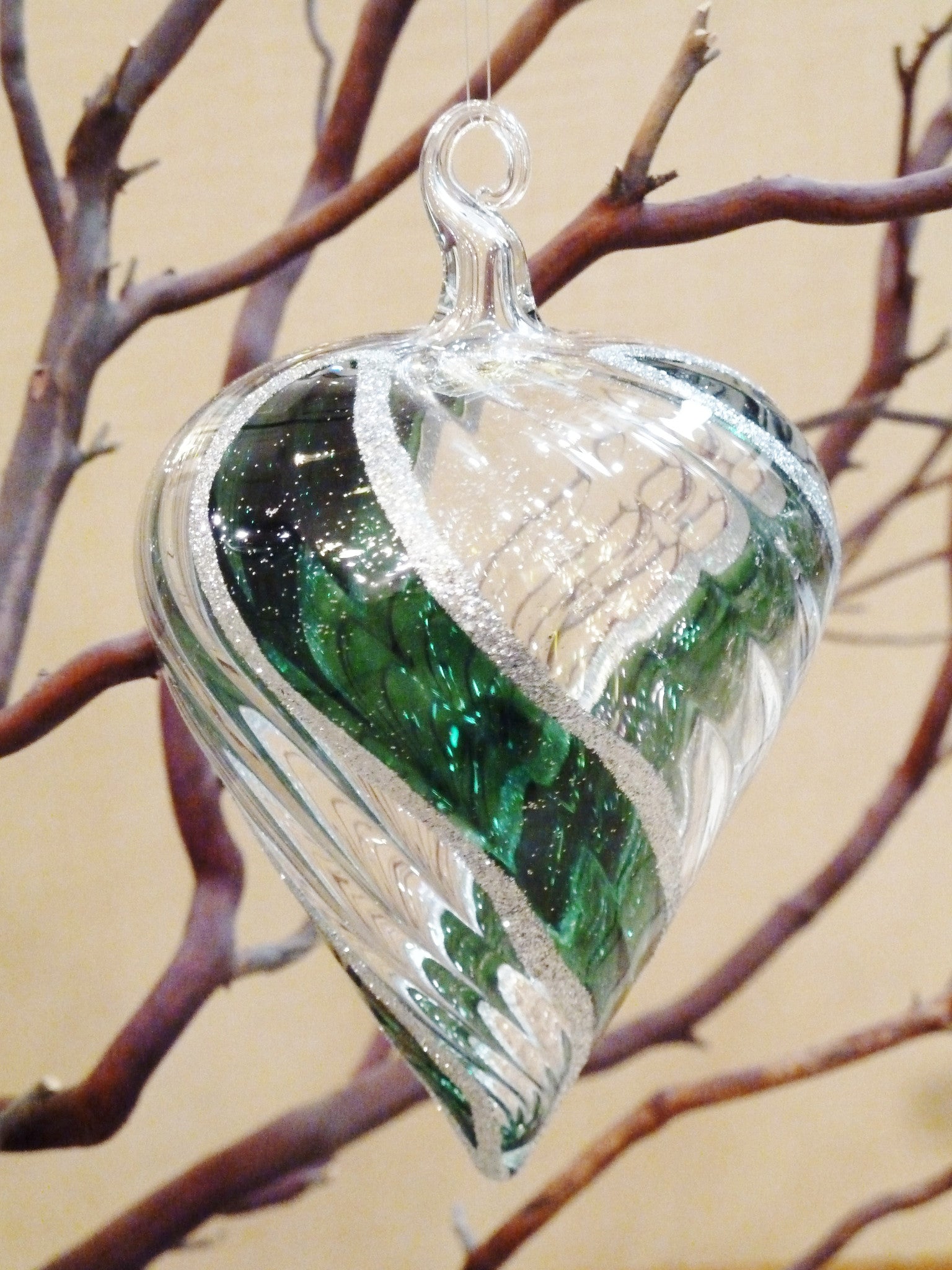 You can tell an individually hand blown glass ornament by the weight. Decorated luxuriously with shimmering glitter and hand painted green completes a festive look.