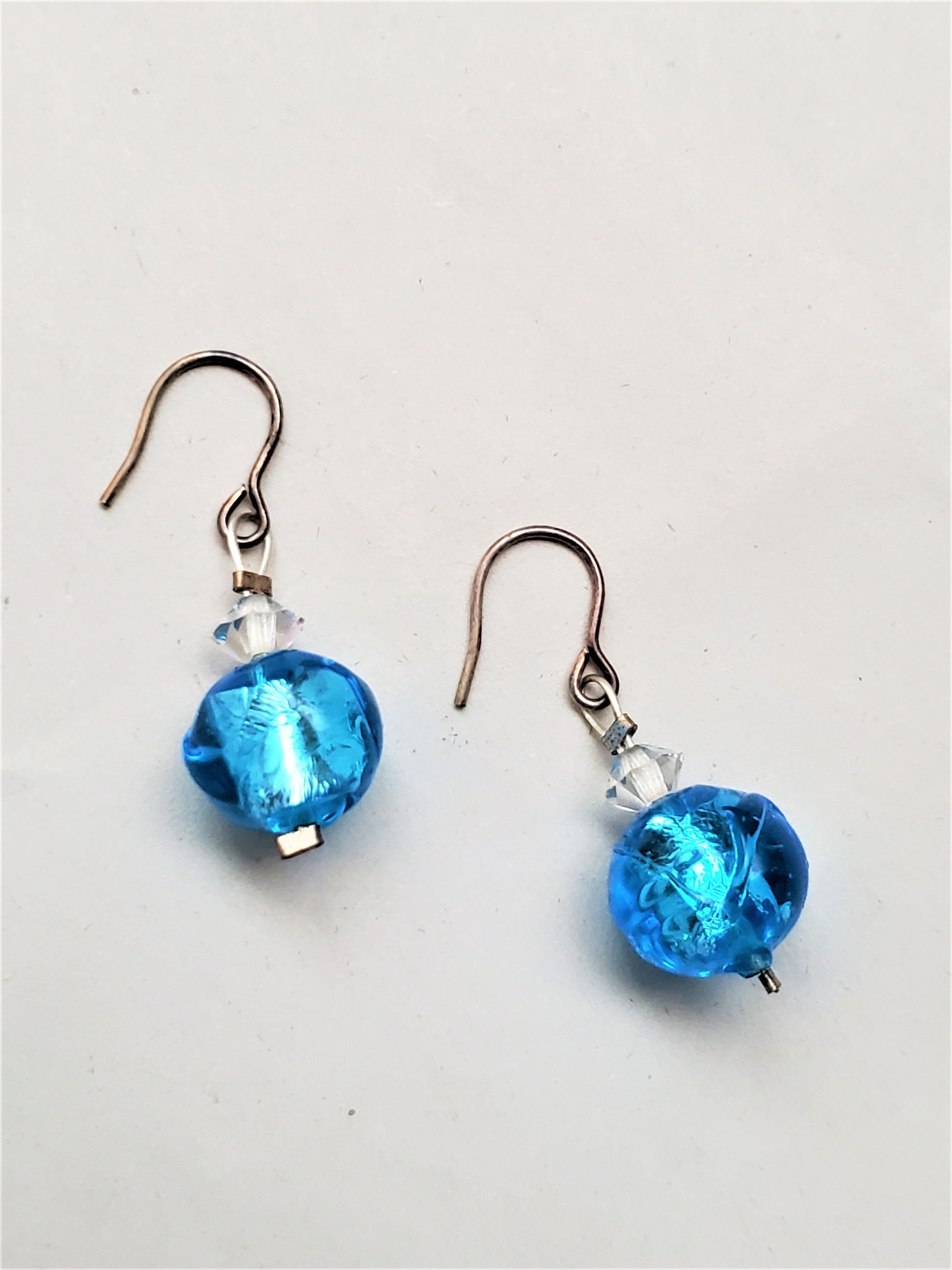 Beautiful blue glass with silver foil. The color is reminicent of the waters of the Key's when the sun hits the water just right. Topped off with Swarovski crystal.